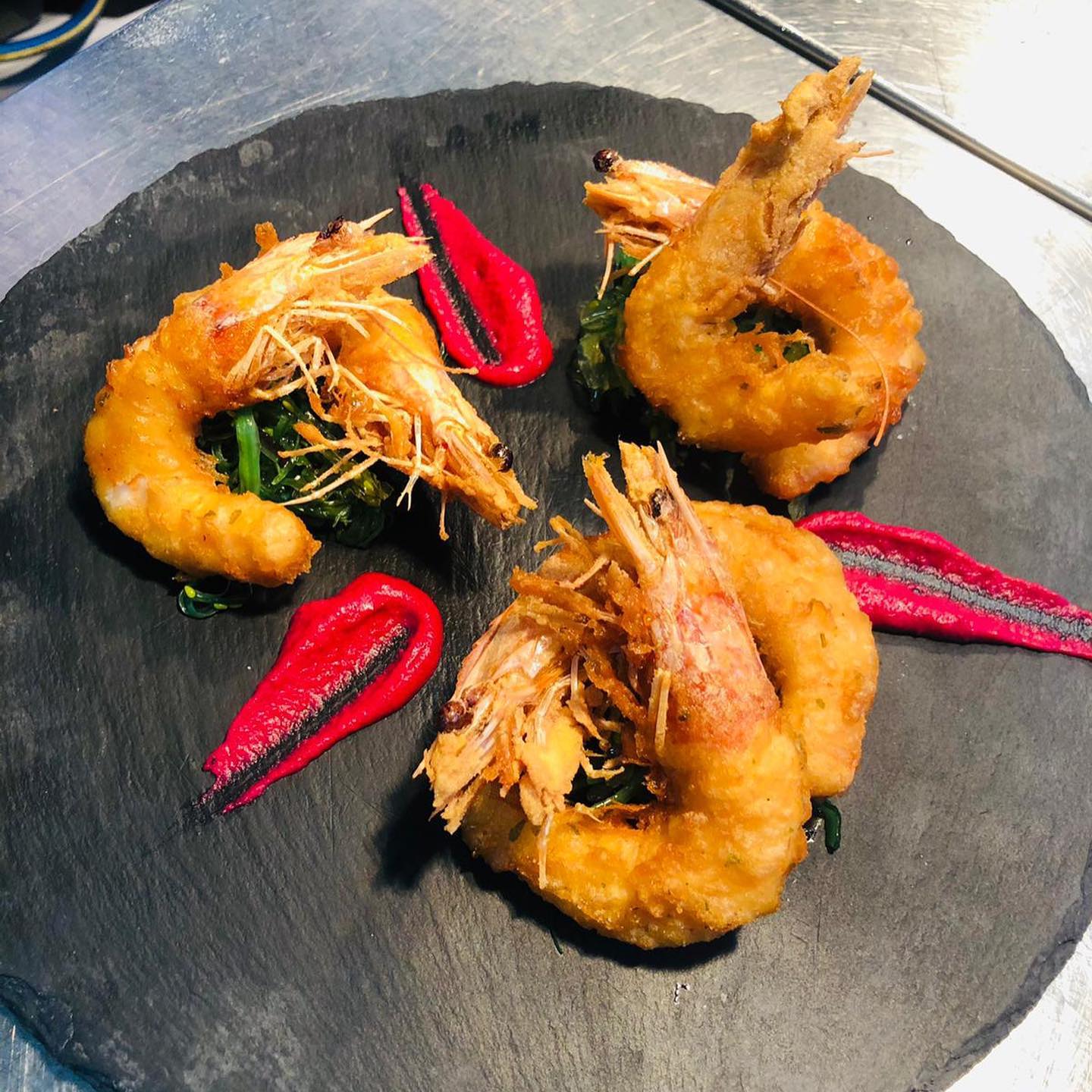 - battuto di gamberi a crudo con scampi del mediterraneo crudi ed emulsione di frutto della passione, fiori e frutti di bosco;